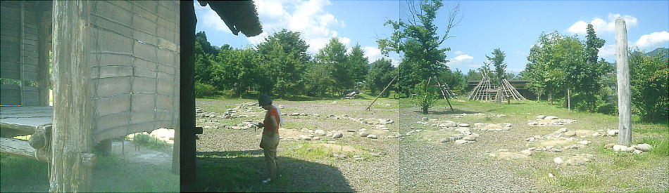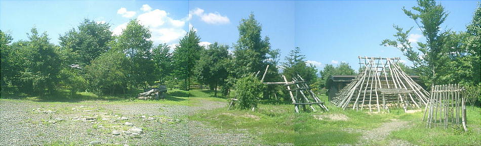 上左に、11号住居址保存遺構。当時の建築材が残る形で復元。