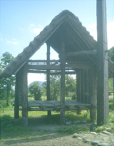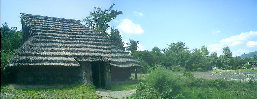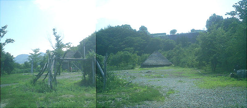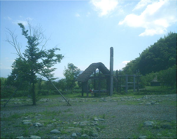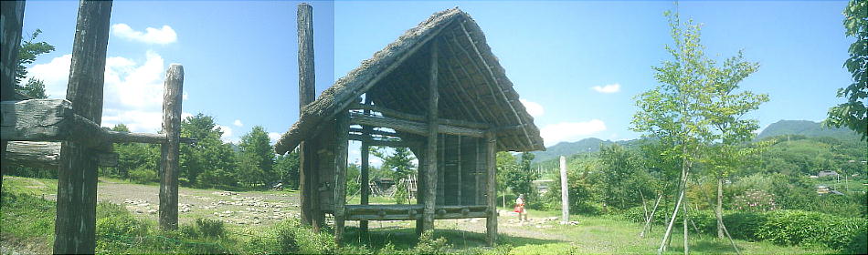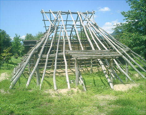 下は9号住居跡のスケルトン復元住居。この後ろに「四隅袖付炉」の展示施設がある。