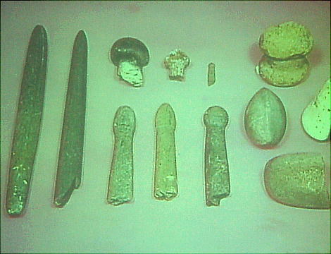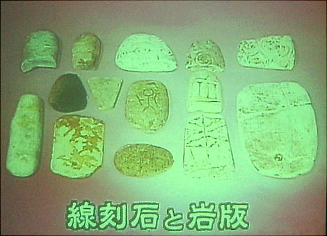 人物を描いた線刻石、特殊な作りの香炉形土器、二千点を超える石鏃、アスファルト接着剤が付いた石器、先端を尖らせた骨角器、精