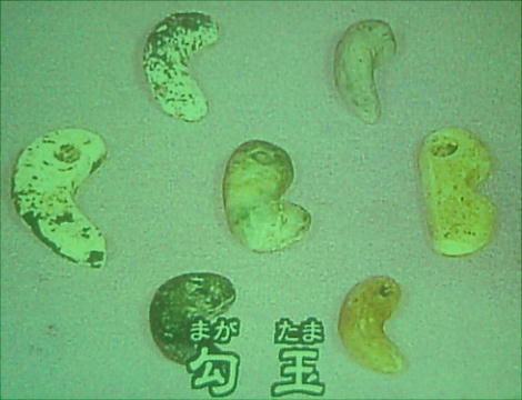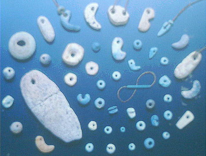 巧に作られた漏斗状耳飾り、他地域にはみられない細長い管玉、ヒスイで作った勾玉、白く軟らかい石による岩版、赤色塗料を入れた