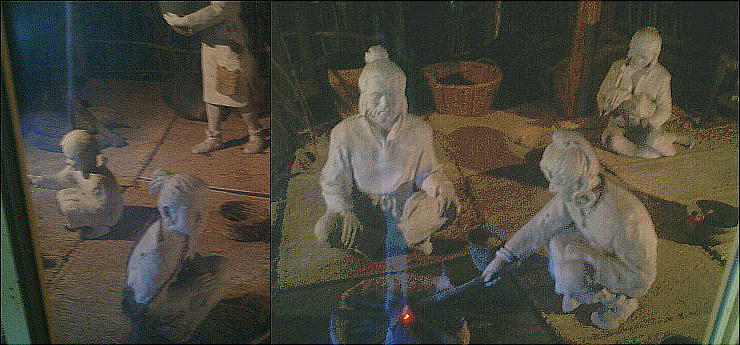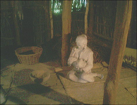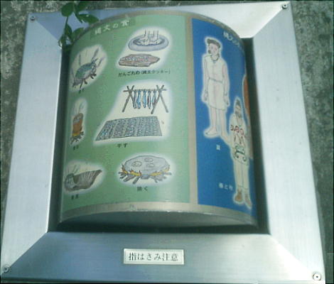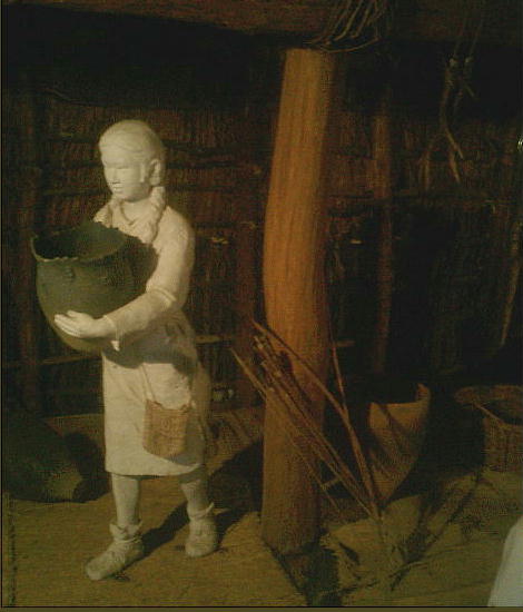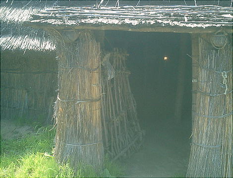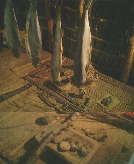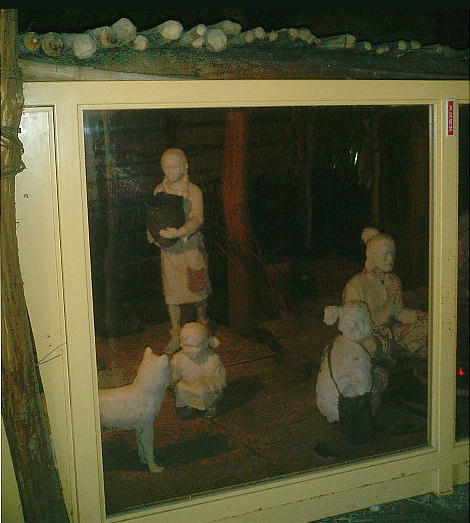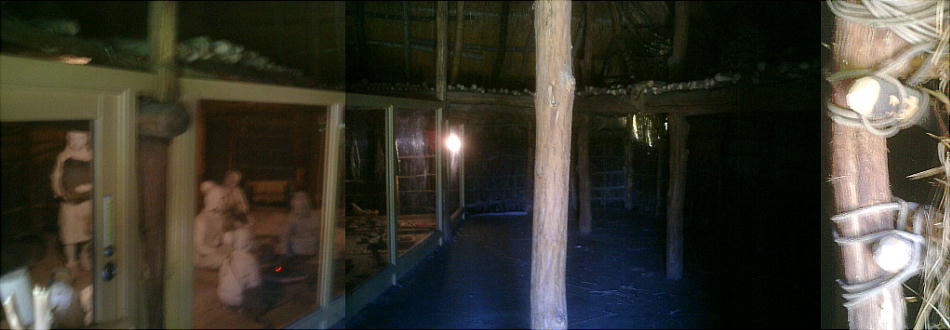 上右端の復元施設(1号住居址。下)の中には、縄文人達の暮らしぶりを再現した展示室が造ってあった。こういうのは始めて見た。