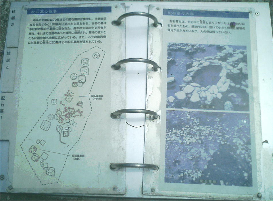 見られる。集落の中央付近および南側の一定区域には、円礫を雑然と並べた形態の100基以上の配石墓群が小グループごとに造