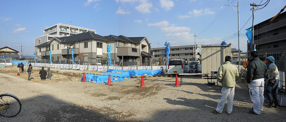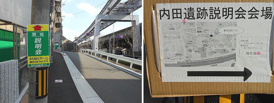 電話で豊中市教育委員会の人に聞いたとおり、モノレールに沿って大阪側へ戻る。当初、上左の案内に沿って歩いていたら住宅販売の