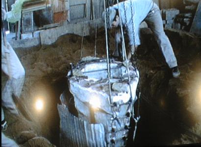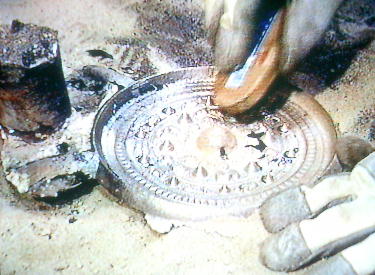 る様子である。 反転後の鋳型の上面には青銅器の原型が埋め込まれて