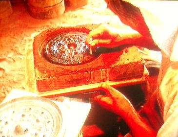鋳型を丁寧に整形する。 鋳型を貼り合わせ、内部の空洞に溶けた金属を流し込む