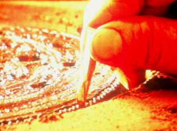 用意した石材(石英)を藁灰で焼き、冷めた後砥石で表面を滑らかに磨く。次に長さ30cmの銅剣の輪郭を描き、鉄製ノミで慎重に彫っていく(写真左)。