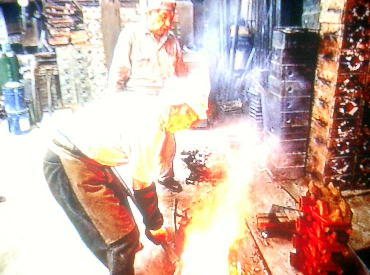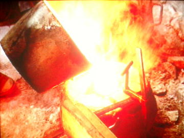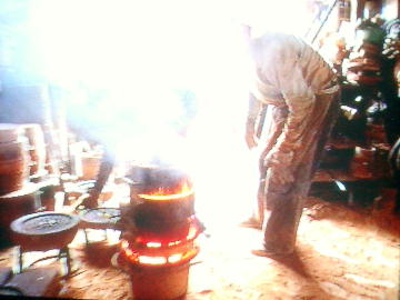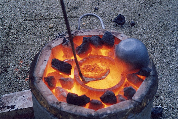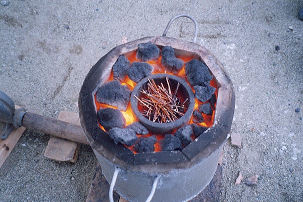 る。熱した炉にルツボを置き、その内部に青銅の材料で る。写真は青銅器の鋳型に流し込む金属を溶解している