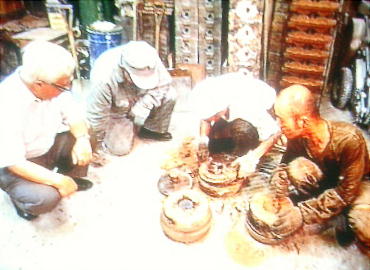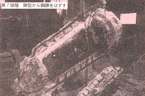 の鋳型を貼り合わせ、内部の空洞に溶けた金属を流 原型を取り外している様子である。