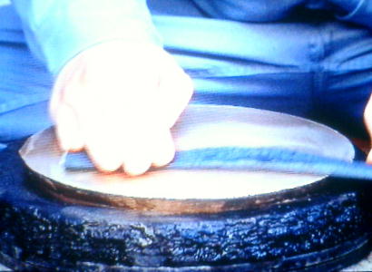 表面の凸凹を滑らかにするのには、現代でも相当の注意と忍耐を要する。輝く黄金色の完成品を生み出すまでに、相当の