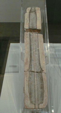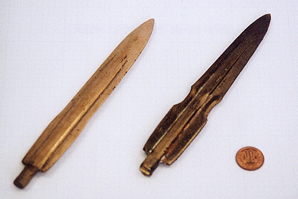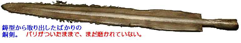 真は、青銅器の鋳造後に取り外された2つの鋳型で って製作された銅剣である。