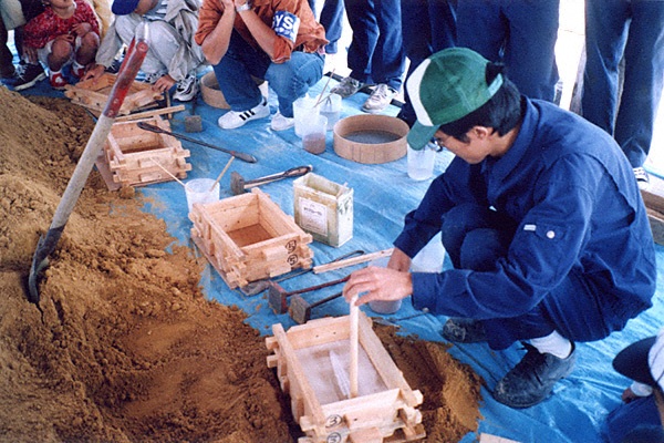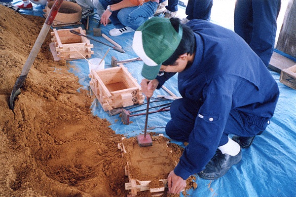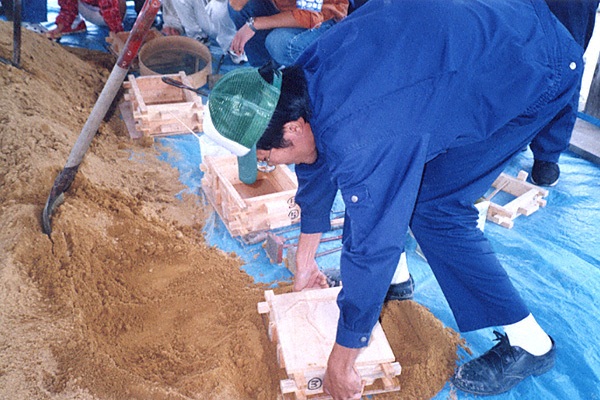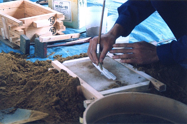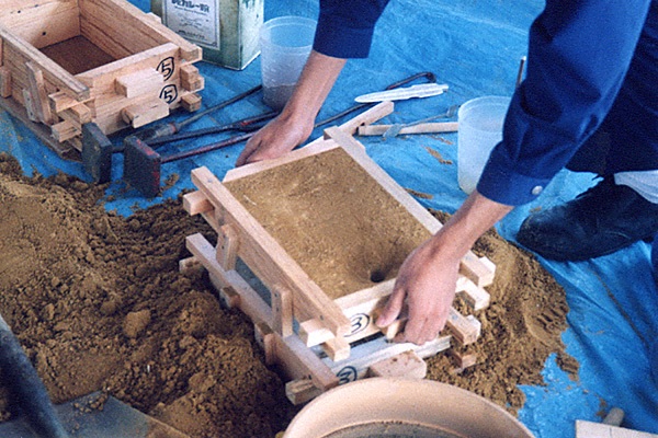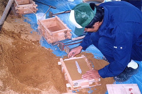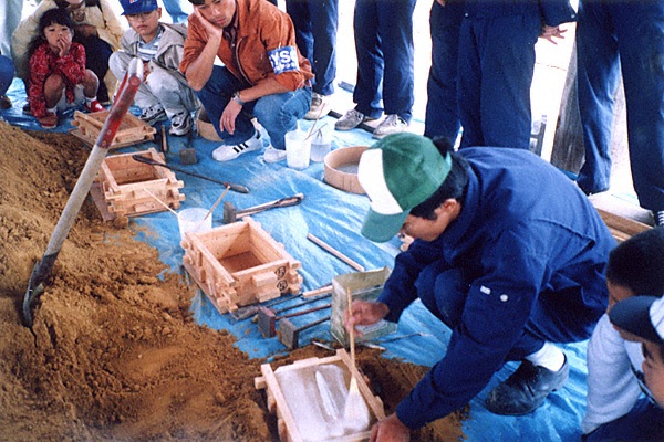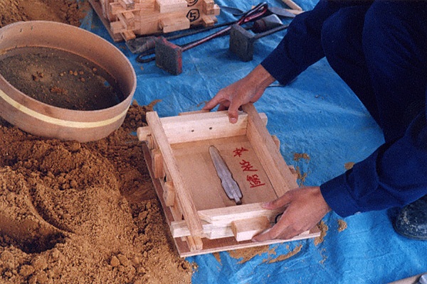 【銅剣の鋳型づくり】弥生時代、銅剣の鋳型は石で作ら 【鋳物砂の箱詰め】写真は鋳物砂を箱に詰めている様子