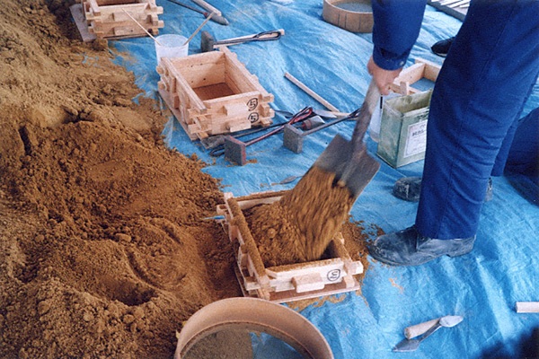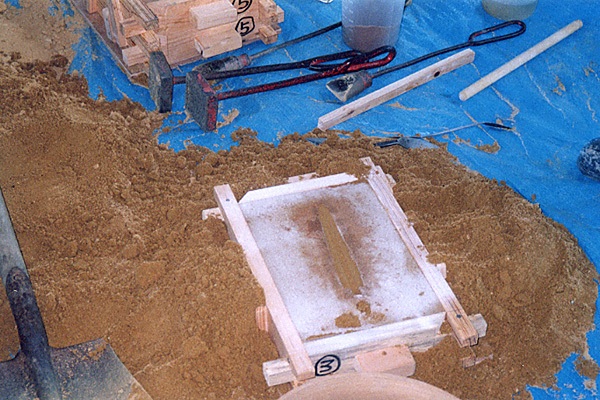 最初は、前項の佐賀県文化財課の実験と同じく、容易に製作できる鋳物砂(生型:なまがた)で鋳型が作られた。しかし