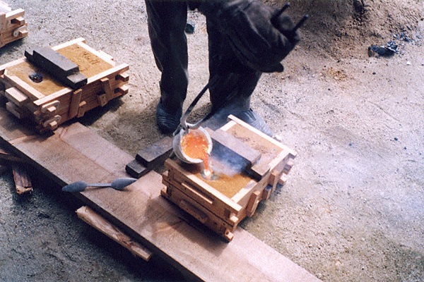 の空洞に溶けた金属を流し込む。写真は片方の鋳型 せている様子である。ただし上側の鋳型には金属を流