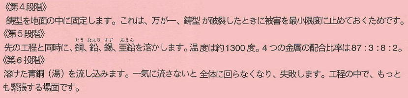 【鋳型の完成】鋳造では2つの鋳型を貼り合わせ、 【銅の流し込み】写真は完成した鋳型におもりを乗せて