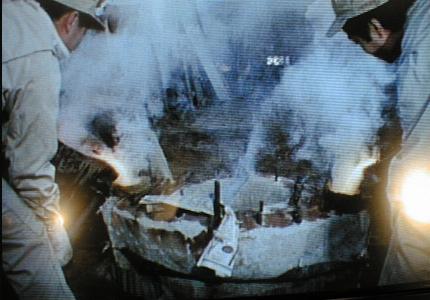 1本に穴を開け金属資料を採取したところ、表面は青く錆びていたが内部は金色に輝いていたそうである。