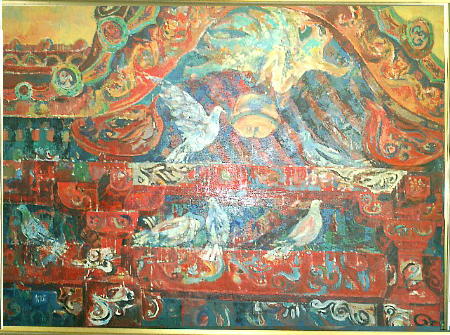 宝物殿入り口を入って入場料を払い、展示場に入るとすぐ右の壁に「天空をかける磐井」の絵があった。絵の具の厚さ、筆