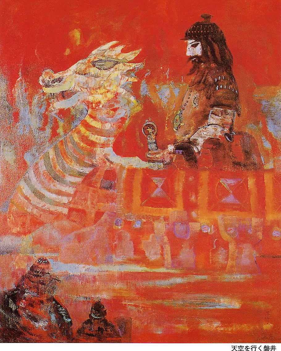 満宮所蔵の「天空を行く磐井」は、この作者の磐井を描いたものとしては代表的な作品であり、その大胆な色づかい、構図は見