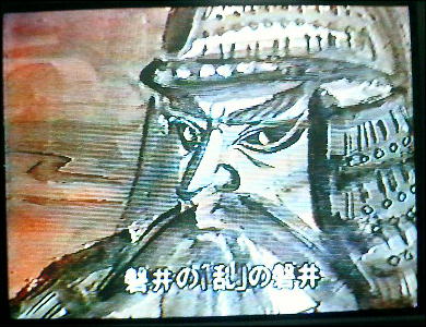 「血か炎か−赤いキャンパスに武将の白い横顔が浮かび上がり、「情熱」と「冷徹」、「再生」と「死」などのダブルイメージ
