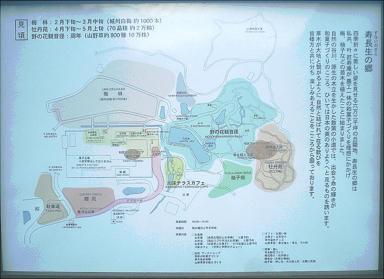 が植られている。梅林、牡丹苑など郷全体が野趣と風雅の空気に包まれている。一期一会の大切さを野の花や咲き誇る梅や桜を愛で