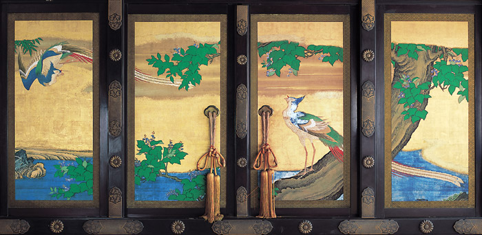 鶴沢派の鶴沢探真ら御用絵師系の画家が担当し、実際の日常生活の空間である御小座敷は円山派の中島来章や四条派の塩川文麟が「花