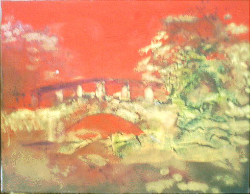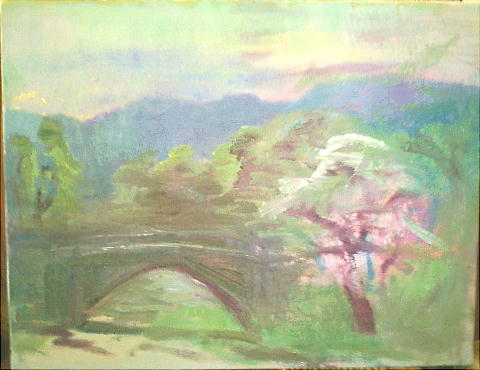 上下は制作中の絵。私の生まれ故郷、秋月の目鏡橋(めがねばし)である。上下でちょっと色合いが異なって写ってしま