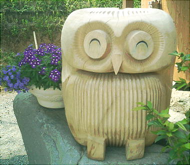 久間さんが彫ったふくろうの像が訪問者を迎えてくれる茶屋の入り口。その前で先生と記念撮影。