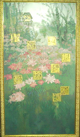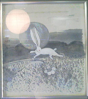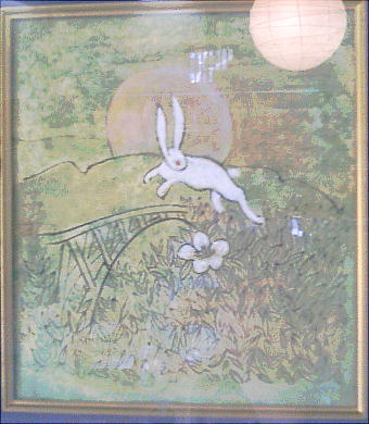 上の絵は花々を〇〇さんが描いたそうで、先生と〇〇さんの共同制作のような絵だった。「おぼろ橋」と月とウサギをあ