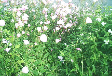 上左は、深い谷にかかる「おぼろ橋」。大きな橋だった。周囲には花もたくさん咲いていて、ほんとに爽やかな高原である。