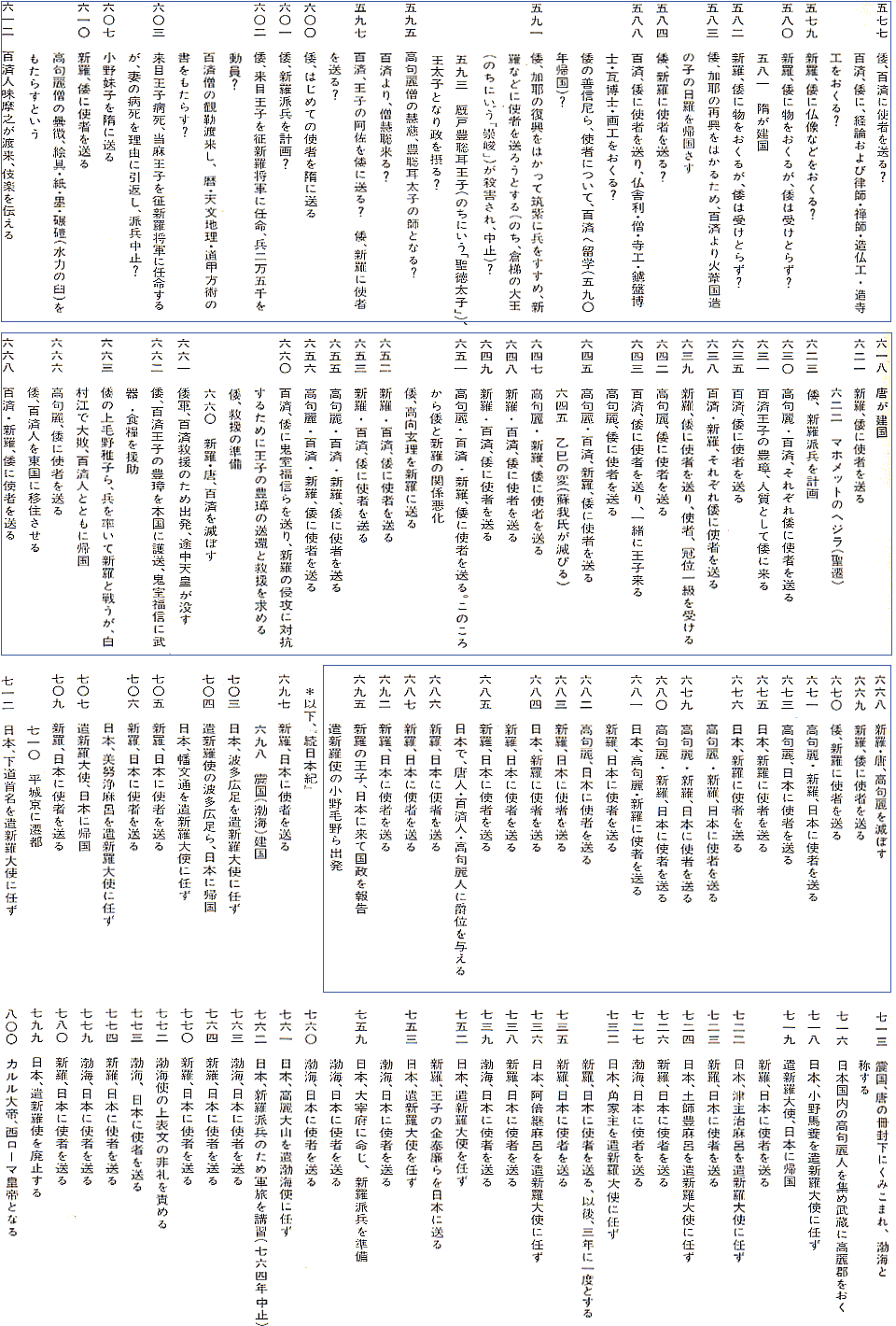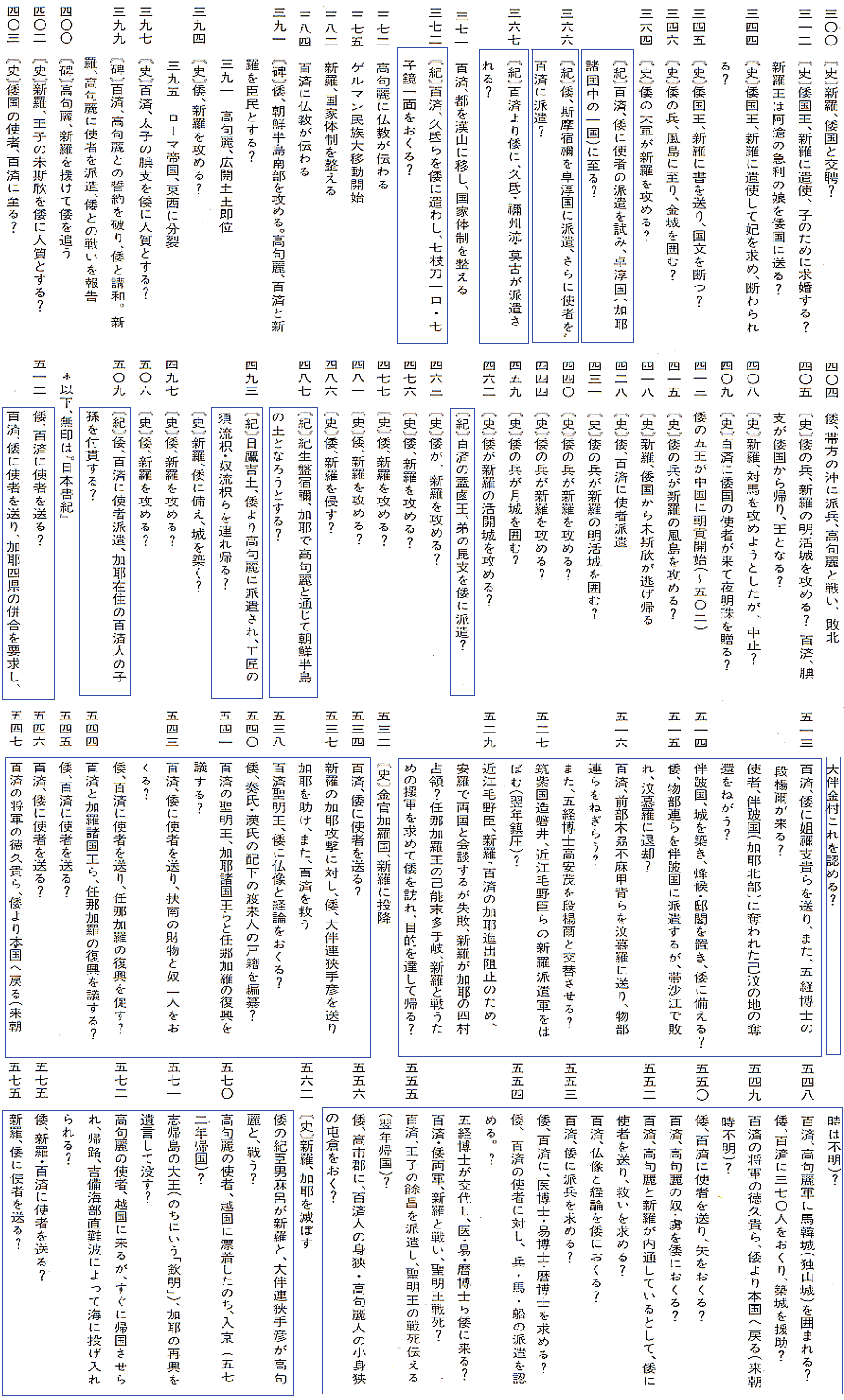 っ取り早いのだが、以下に日本書紀に出現する記事を一覧表にしてある。2書以外の文献の記事も載っているが、