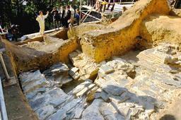 カヅマヤマ古墳の板石積み石室。14世紀の地震で、大半が左奥の人物の方向に崩れた