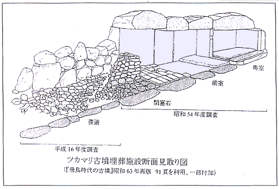 り固めてあった。板石積み石室は百済の王墓など朝鮮半島に多く見られる。床の中央に高さ30センチの