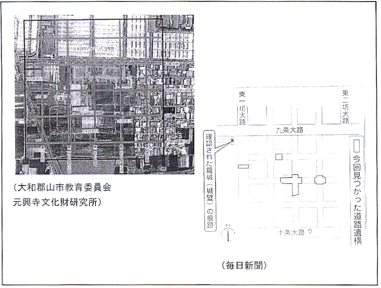 区画道路跡は九条大路の南約400メートルで見つかり、3カ所の交差点を確認。いずれも平城京内と