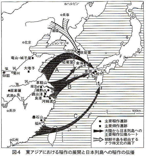 ★図4のA・Bのコースから温帯ジャポニカが、Cのコースから熱帯ジャポニカが伝播した。これら水稲稲作の