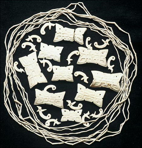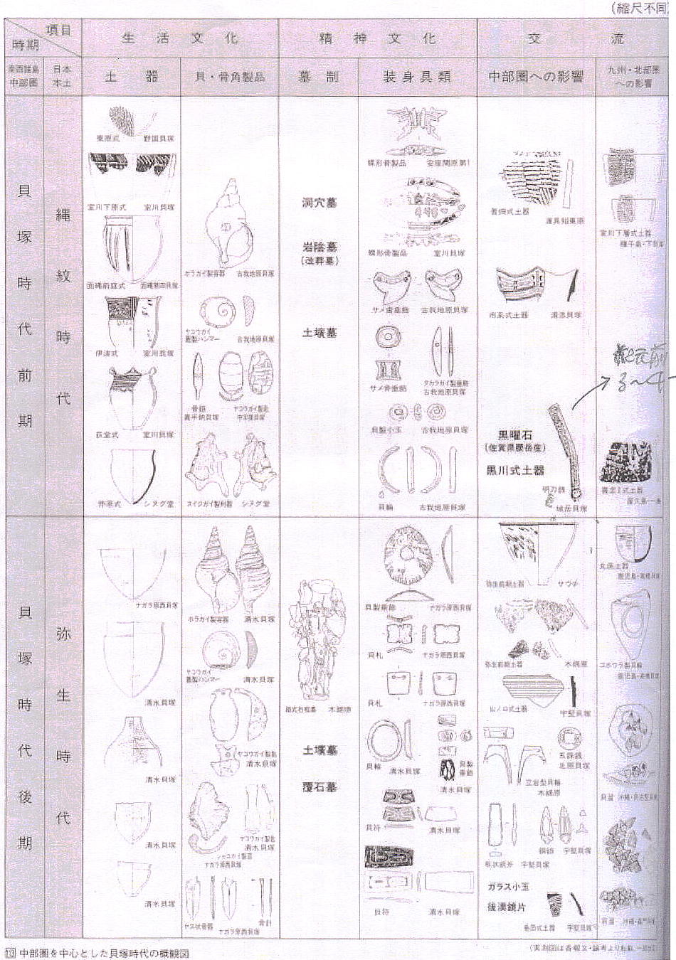 は最も背の低い人々である。一応、縄文人的特徴を強く残した人々とされているが、独特の文様が彫られた貝製副葬品には、大陸