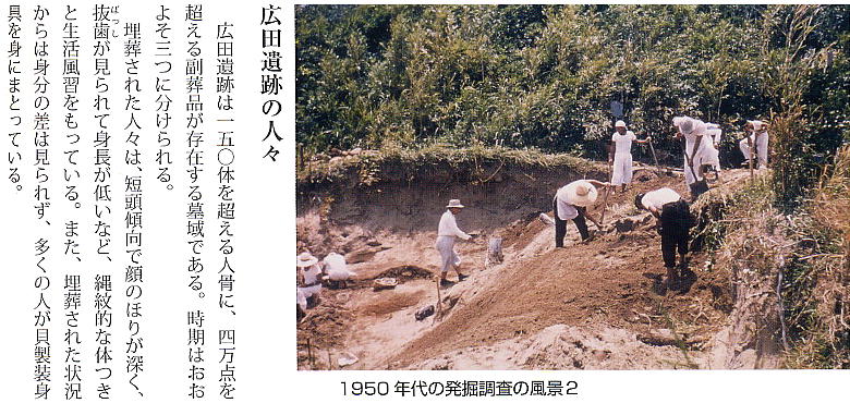 広田遺跡からは、上下2層から150体以上の人骨が発見された。下層は屈葬で,サンゴ塊を周囲に置いたものが多く,巫女らし