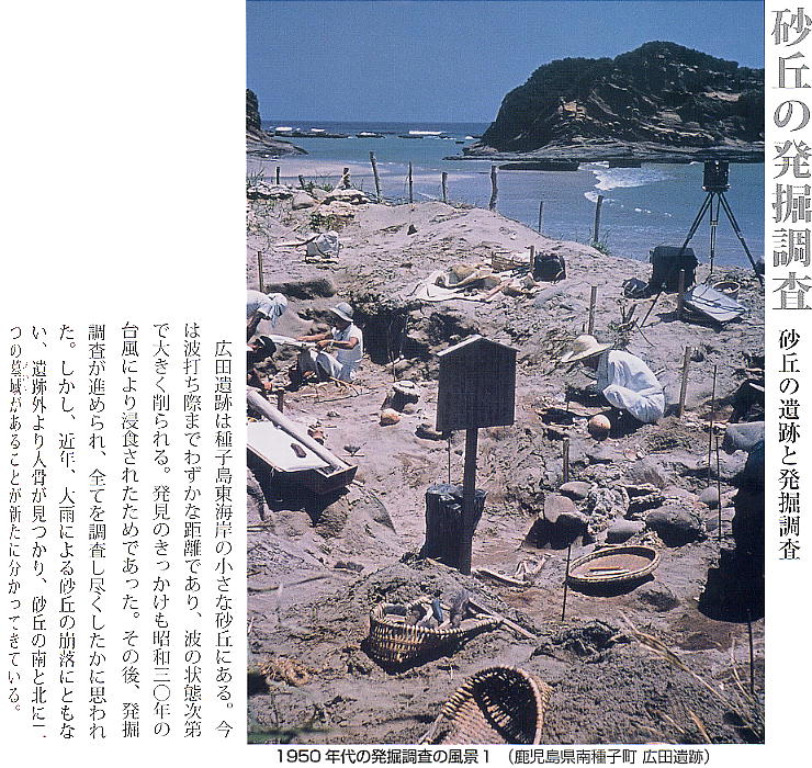 昭和30年、台風22号によって「広田遺跡」のある砂丘の海側の一部が崩壊し、人骨や貝でつくられた製品が砂浜に転がって