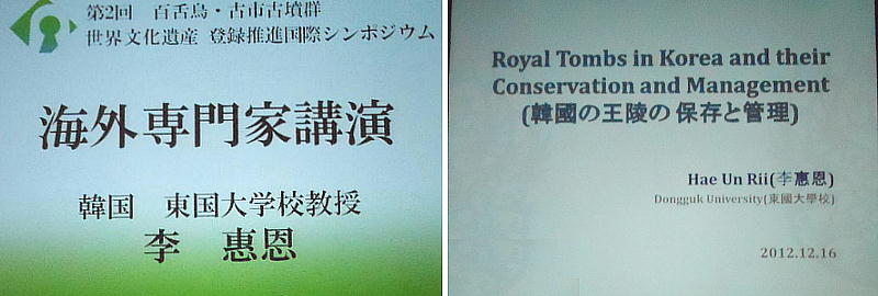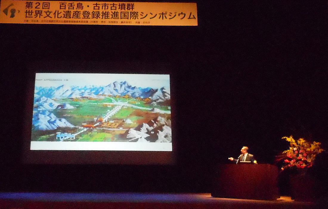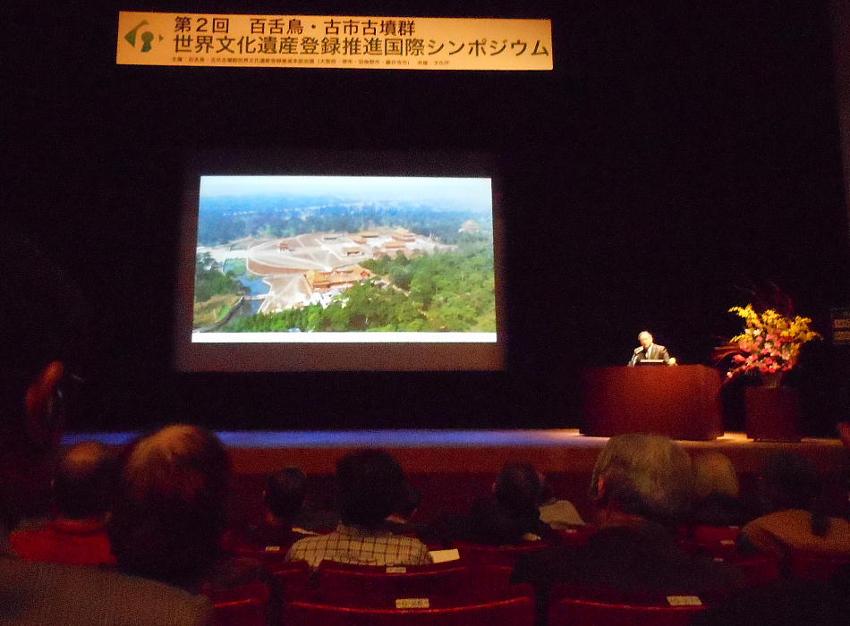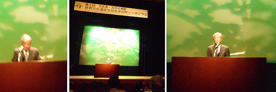 白石太一郎がまず基調講演として「百舌鳥・古市古墳群の価値について」の話をした。世界遺産に指定されることの意味、その価値