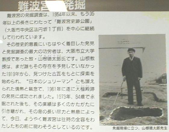 の教授であった山根徳太郎氏である。この瓦は奈良時代のものと考えられたことから、この地に難波宮のあることを確信した山
