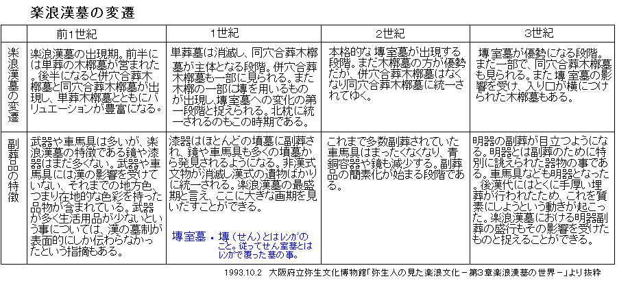 が残っており、その埋葬方法や副葬品を調べることによって、楽浪郡が次第に朝鮮色から漢色に染まっていく過程