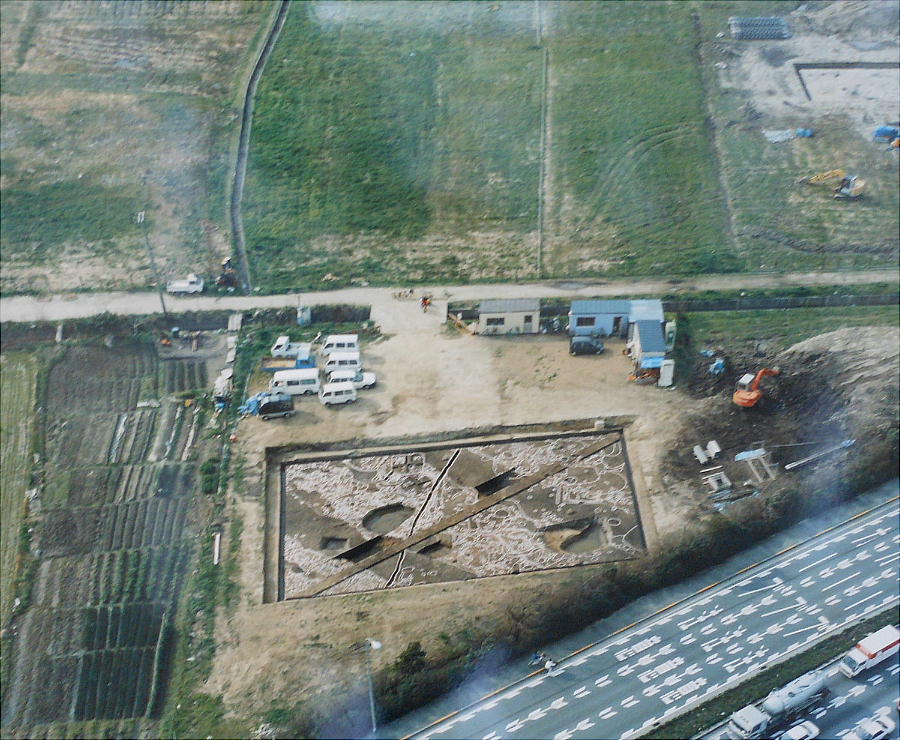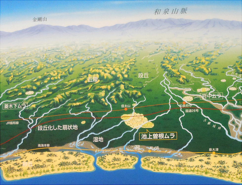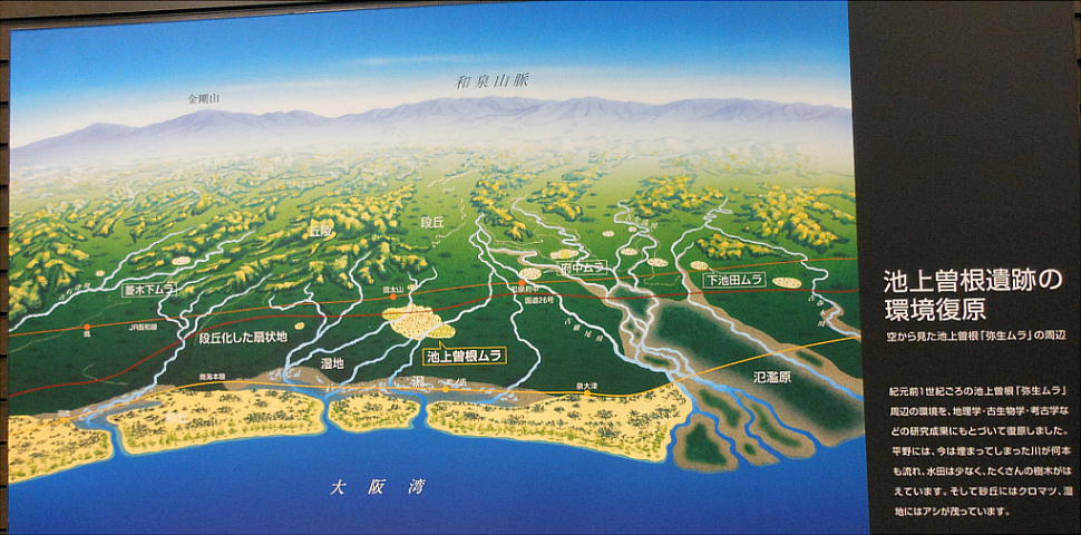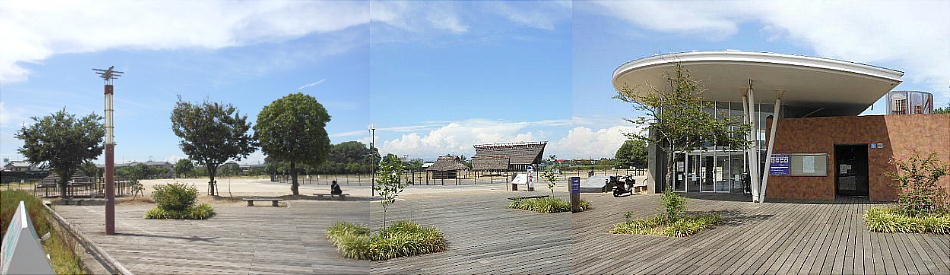 上、右端のUFOのような屋根を持った建物が「池上曽根遺跡・情報館」である。