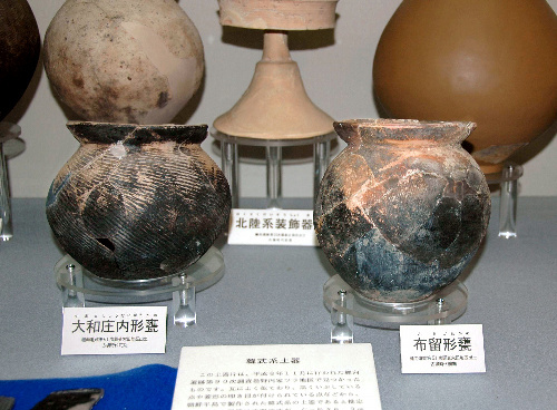 箸墓古墳の付近で出土した土器(写真手前の2点)。これらの付着物で年代が測定された=奈良県桜井市立埋蔵文化財センター