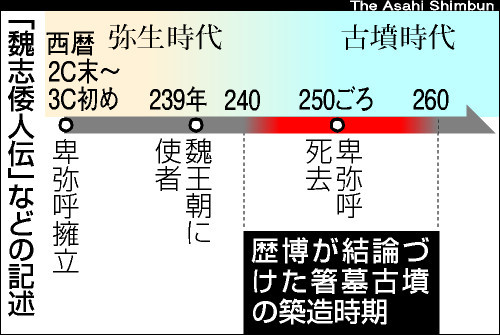 この年代は、魏志倭人伝に「卑弥呼以て死す、大いに冢(ちょう)を作る」と記載された247年頃と時期が一致し、倭の女王・卑