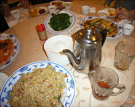 とにかく量が多い。豚の角煮など日本の倍の大きさだ。上左の、私の皿の上に乗っているのか一切れの角煮。