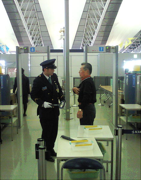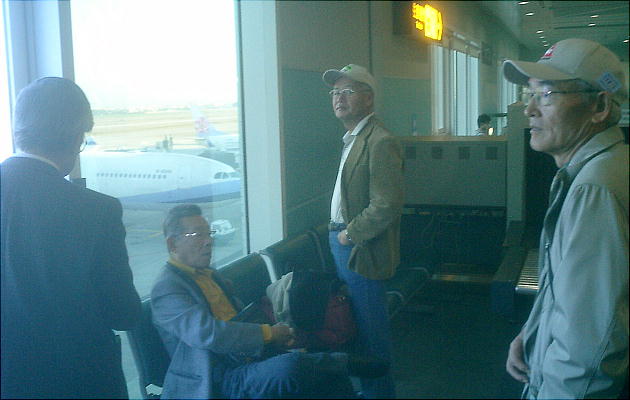 チェツクインして搭乗口へ向かう。ボディ−チェツクでまた橋本さんが引っかかる。検査の兄ちゃんに「靴の上から調べてもわから