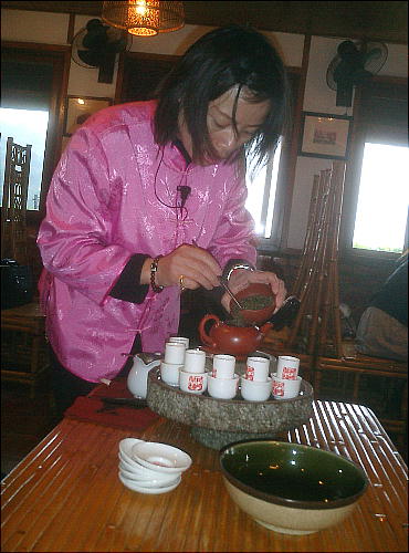 お茶を呑む前に、急須や湯飲みにザブザブ湯を掛けるのは本土と一緒やね。その辺りの作法は日本へは伝わらなかったようだ。