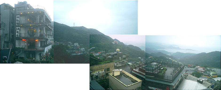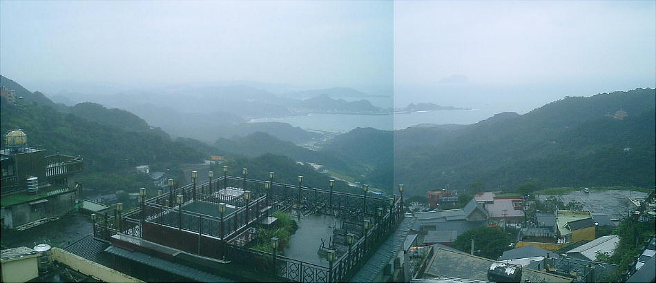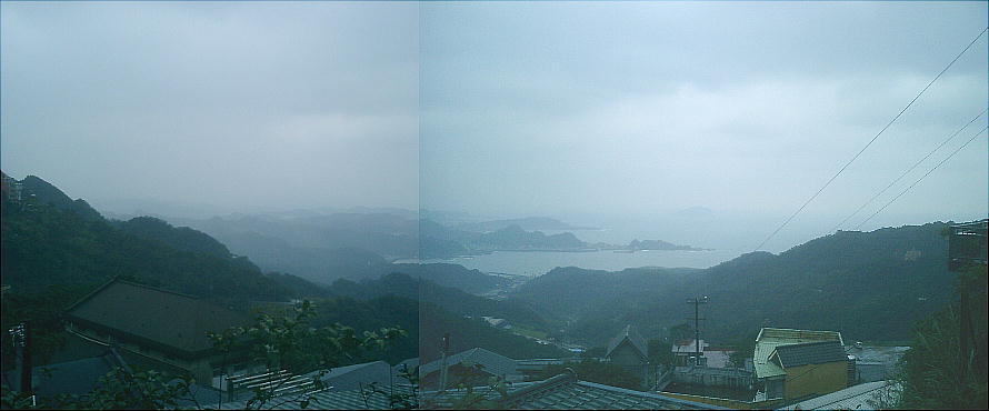 茶房の屋上へ出ると、周囲を見渡せる素晴らしい展望が開けている。ここからは英□湾が一望出来る。小雨に煙る台湾の海を、山の