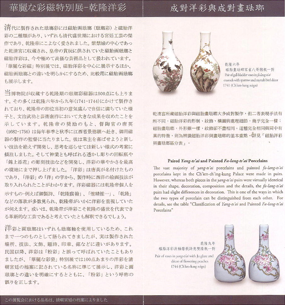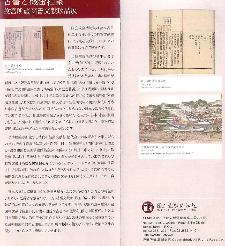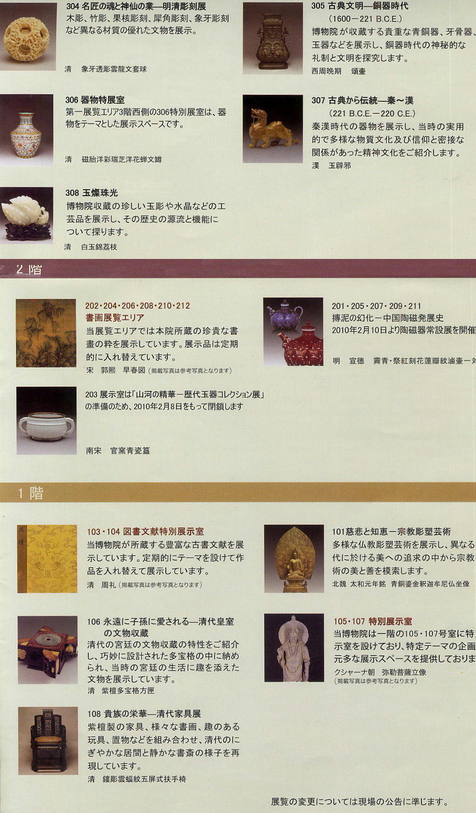 ずれも清朝の宮廷の歴史、宮廷の生活を反映した実物や資料であり、典制文物・宗教関係の文物・書・絵画・磁器・刺しゅう・碑刻な