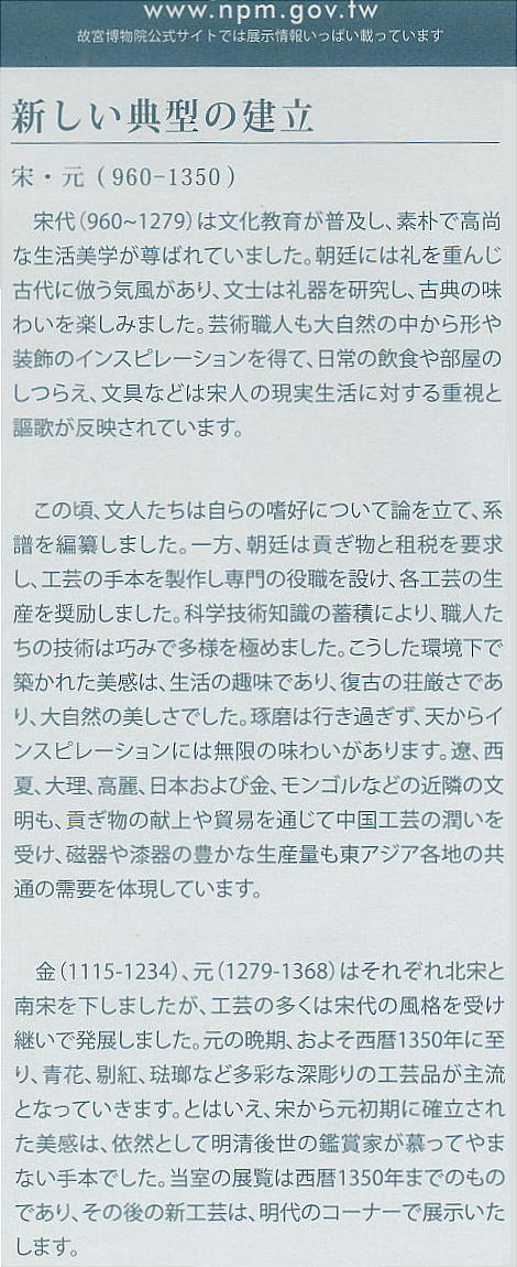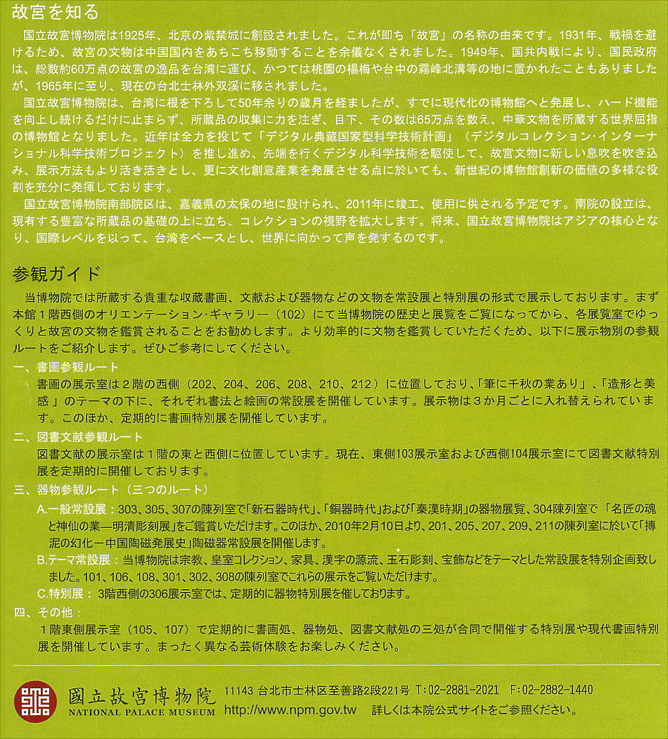 生したのが台北市の國立故宮博物院であり、現在故宮博物院の所蔵品は北京と台北の2カ所に別れて展示されている。これとは別に所