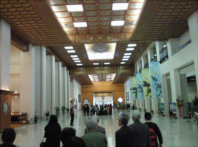 屋根 - 北京の天壇を模して造られた本堂の屋根は八角形で、「忠、孝、仁、愛、信、義、和、平」の八徳を象徴している。