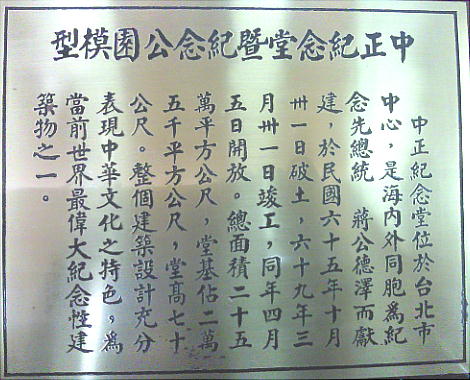 中正紀念堂(ちゅうせいきねんどう)は中華民国台北市中正区に位置する総統?介石の顕彰施設。中国の伝統的な宮殿陵墓式が採用